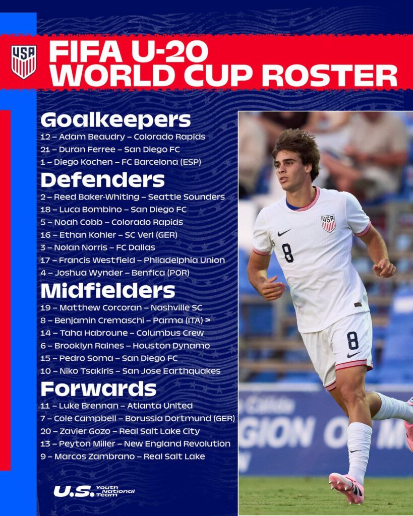 Estados Unidos disputará el Mundial de Chile en el Grupo E donde se medirá a Nueva Caledonia, Francia y Sudáfrica. Allí aparece el nombre de Benjamín Cremaschi, mediocampista que llegó esta temporada al Parma de Italia proveniente del Inter Miami de la MLS.